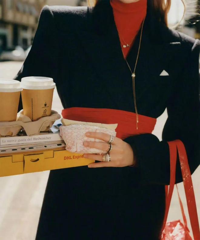比如这里细围巾作为choker的用法,好像一条水平线,清晰划分出脖子的真实位置。 ▼