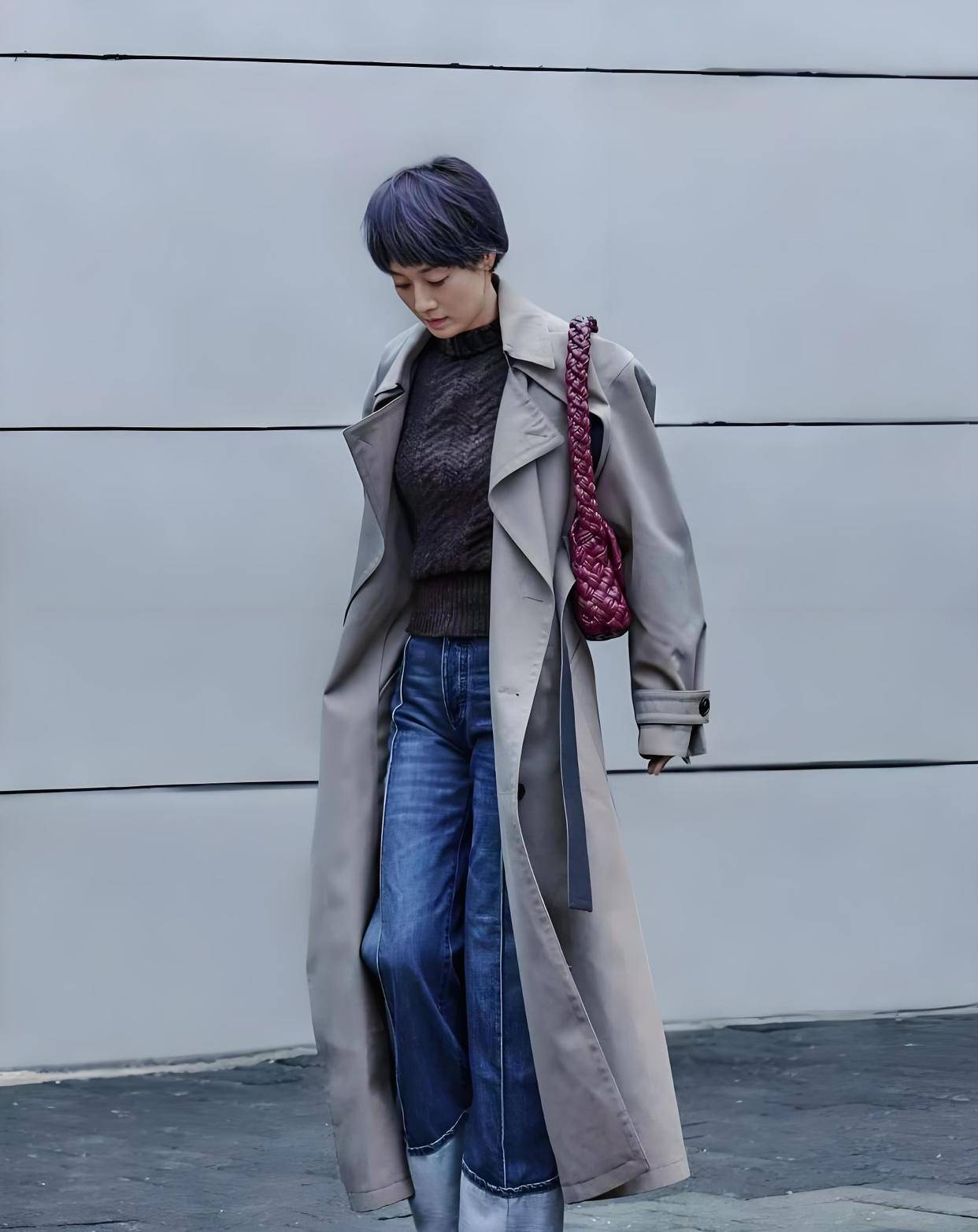 风衣+高领针织衫+牛仔裤的搭配中,长款风衣适合高个子女生。 黑色高领针织衫在天凉时保护颈部,宽松版型有很好遮肉效果。