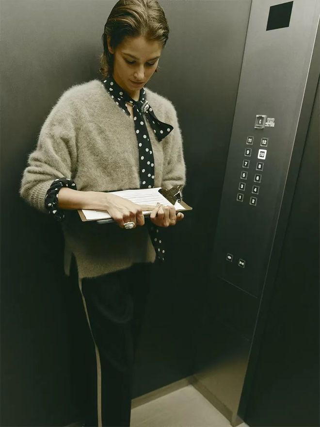 她选择的大多是优雅的小领型,比如小V领、一字领。虽然领口小,但是有纵向线条,依然有用!