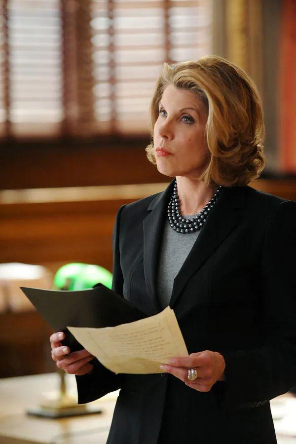 美剧《傲骨贤妻》里的戴安Diane,她的脖颈也不算纤长,并且因为律所女魔头的设定,她的穿搭需要得体有气场,露肤度不能太高。▼
