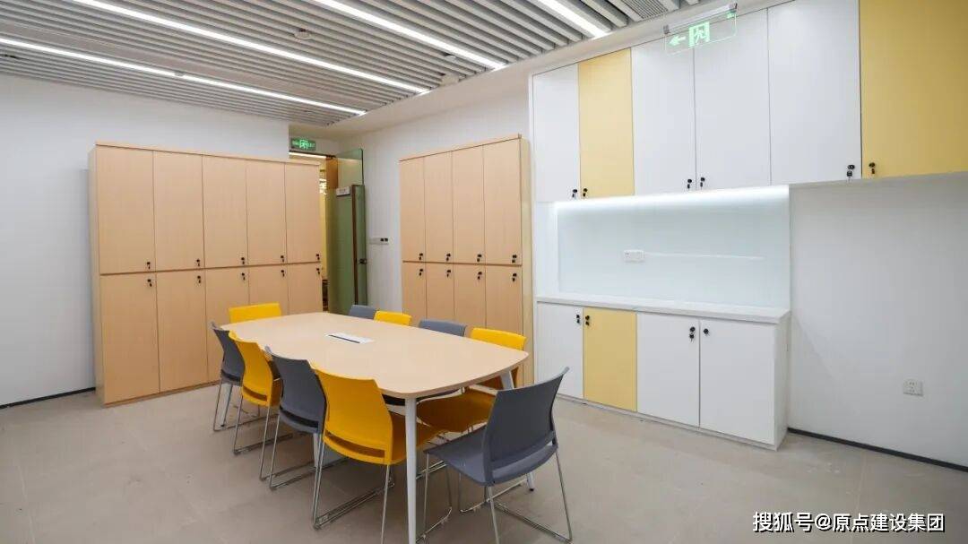 职工之家功能区装修简洁明快,背景墙融合米白色储物柜与嵌入式显示屏,中性色调中跳跃的黄色点缀营造出明亮活泼的氛围。